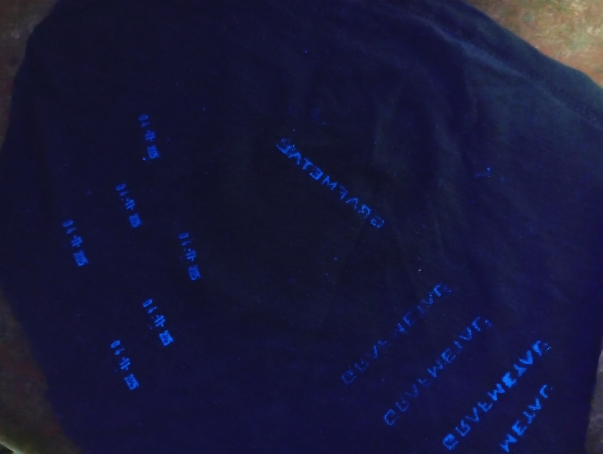 The ink is not suitable for surfaces already covered with similar fluorescent materials, such as white paper or white clothing, as the contrast will then be low, as shown in the photo below.