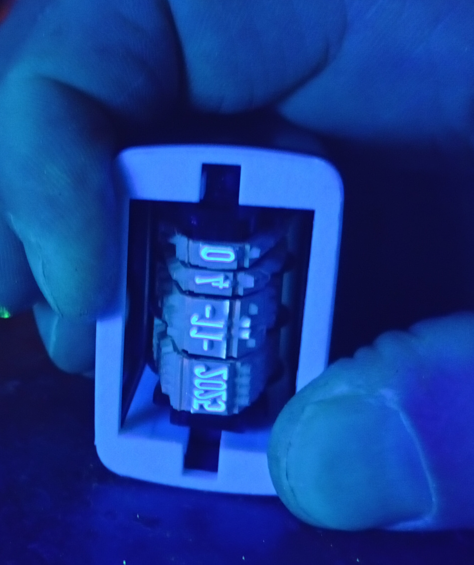 GRAFMETAL's invisible fluorescent UV-glowing STAMP INK will make objects covered with it glow bright blue when illuminated with UV light, while remaining transparent and colorless in visible light.