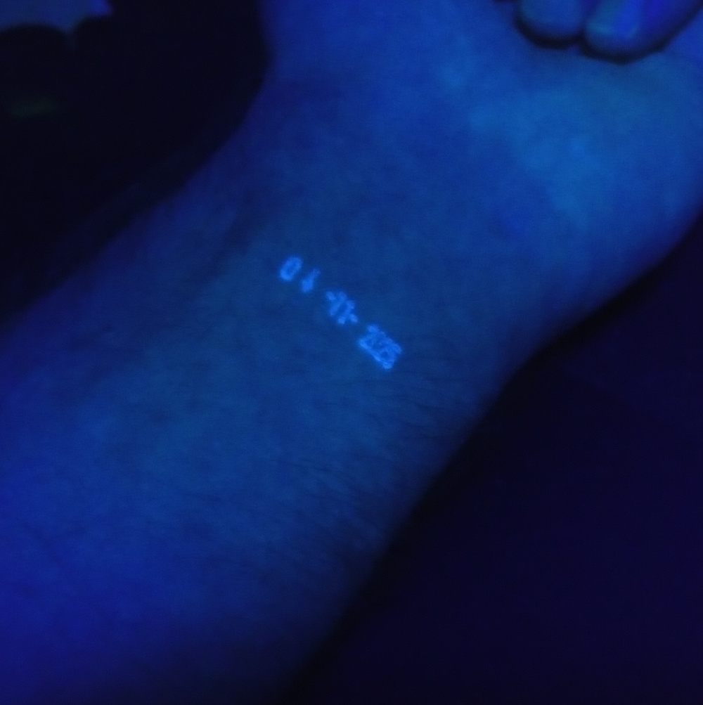 Tusz nie nadaje się do powierzchni pokrytych już podobnymi materiałami fluorescencyjnymi, takimi jak biały papier lub białe ubrania, gdyż kontrast będzie wówczas niewielki, co pokazano na zdjęciu poniżej.